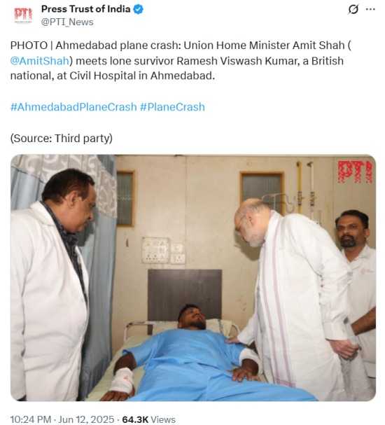 দ্য ওয়াল ব্যুরো: সম্প্রতি আমদাবাদে ঘটে যাওয়া এয়ার ইন্ডিয়া এআই-১৭১ (AI-171) বিমান দুর্ঘটনায় ২৭০ জনের মৃত্যু হয়। সেই ভয়াবহ দুর্ঘটনায় একমাত্র জীবিত যাত্রী বিশ্বাসকুমার রমেশকে নিয়ে সোশ্যাল মিডিয়ায় ছড়িয়ে পড়েছে চাঞ্চল্যকর এক ভুয়ো খবর। সংবেদনশীল এই ভিডিওটি দ্রুত ভাইরাল হয়ে পড়ে, ৩৮ হাজারেরও বেশি লাইক পায়।