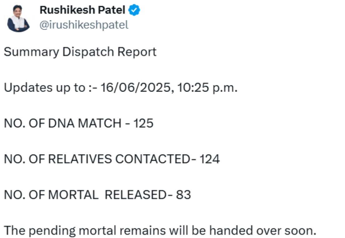 সোমবার রাতে এক টুইটে গুজরাতের মন্ত্রী রুশিকেশ জানান, এয়ার ইন্ডিয়ার বিমান দুর্ঘটনায় সোমবার রাত ১০টা ২৫ পর্যন্ত ১২৫টি ডিএনএ নমুনা মিলেছে এবং এখনও পর্যন্ত ১২৪ জন নিহতের আত্মীয়দের সাথে যোগাযোগ করা হয়েছে। ৮৩ জনের মৃতদেহ তাদের পরিবারের কাছে হস্তান্তর করা হয়েছে। বাকি দেহগুলি শনাক্ত করার প্রক্রিয়াও দ্রুতগতিতে চলছে।