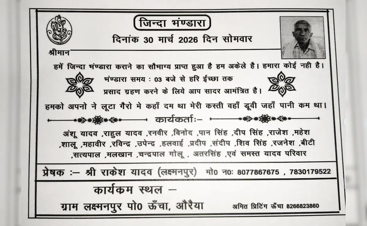 জীবিত অবস্থায় রাকেশ যাদবের ‘ভাণ্ডারা’ আজ অরাইয়া জেলার আলোচনার কেন্দ্রবিন্দু। জীবিত অবস্থায় মৃত্যুবন্দনা শোনায় অদ্ভুত, কিন্তু এর আড়ালে লুকিয়ে আছে এক প্রবীণ মানুষের যন্ত্রণা, হারিয়ে যাওয়া পরিবার, এবং সমাজের প্রতি এক শেষ আস্থা।