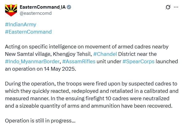 ভারতীয় সেনাবাহিনীর ইস্টার্ন কমান্ড (Eastern Command) জানিয়েছে, মণিপুরের চান্দেল জেলার খেঞ্জয় এলাকার নিউ সামতাল গ্রামে কয়েকজন জঙ্গি লুকিয়ে রয়েছে বলে খবর এসেছিল। তার জন্যই তল্লাশি অভিযান শুরু হয়। এই অভিযানের সময়ই সেনার ওপর অতর্কিতে হামলা চালায় জঙ্গিরা। পাল্টা জবাবও দেওয়া হয়। তাতেই ১০ জঙ্গি খতম হয়েছে। তবে সেনা স্পষ্ট বলেছে, এই অভিযান এখনও শেষ হয়নি। কারণ আরও একাধিক জঙ্গি ওই অঞ্চলে লুকিয়ে রয়েছে বলেই সন্দেহ তাঁদের।