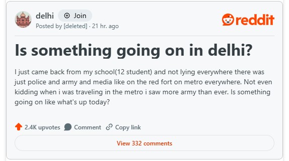 ‘আজ দিল্লিতে কিছু হচ্ছে?’ -এই শিরোনামে পোস্টটি দ্রুত ভাইরাল (Viral Post) হয়। লেখক দাবি করেছেন, তিনি দ্বাদশ শ্রেণির ছাত্র এবং সেদিন স্কুল থেকে ফেরার পথে মেট্রোতে অস্বাভাবিক নিরাপত্তা নজর করেছেন। পোস্টে লেখা ছিল, “স্কুল থেকে ফিরছিলাম, আর দেখলাম মেট্রোতে, রাস্তায়, লালকেল্লার সামনে - যেদিকেই তাকাই পুলিশ আর সেনা। এমন আগে কখনও দেখিনি। মিডিয়াও ছিল প্রচুর। কিছু হচ্ছে নাকি আজ?”