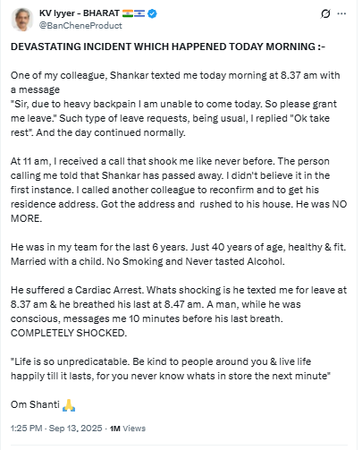 ভাইরাল সেই পোস্টে তিনি লেখেন, “আমার সহকর্মী শঙ্কর সকাল ৮টা ৩৭ মিনিটে মেসেজ করে জানিয়েছিল, ‘স্যার, পিঠে প্রচণ্ড ব্যথা, আজ আসতে পারব না। দয়া করে ছুটি দিন।’ এ ধরনের মেসেজ প্রায়ই আসে। আমি রিপ্লাই করলাম, ‘ঠিক আছে, বিশ্রাম নাও।’ এরপর স্বাভাবিকভাবেই দিন চলছিল। সকাল ১১টায় ফোন পেলাম যে, শঙ্কর মারা গেছেন! বিশ্বাস করতে পারিনি। সহকর্মীর সঙ্গে যোগাযোগ করে ঠিকানা জেনে তার বাড়িতে গেলাম। তখনও বিশ্বাস হচ্ছিল না যেন।”