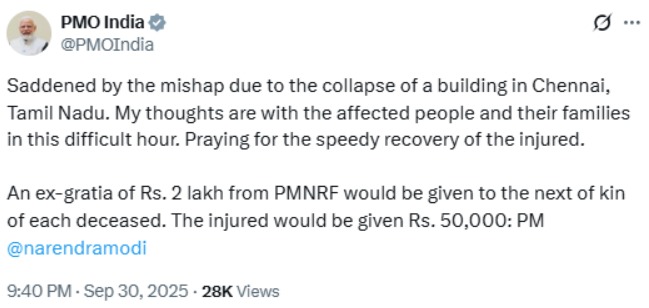 এক্স-এ প্রধানমন্ত্রীর দফতরের বার্তা, “চেন্নাইয়ের দুর্ঘটনায় দুঃখিত। মৃতদের পরিবারের প্রতি সমবেদনা রইল। আহতদের দ্রুত আরোগ্য কামনা করছি।”