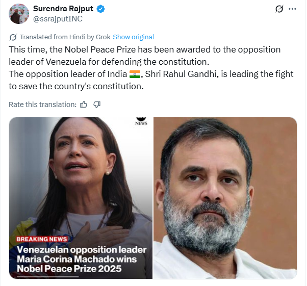 এক্স (X)-এ হিন্দিতে কংগ্রেসের মুখপাত্র লেখেন, “এই বছর ভেনেজুয়েলার বিরোধী নেত্রীকে সংবিধান রক্ষার জন্য নোবেল শান্তি পুরস্কার দেওয়া হয়েছে। ভারতের বিরোধী দলনেতা শ্রী রাহুল গান্ধীও দেশের সংবিধান বাঁচানোর লড়াই লড়ছেন।”