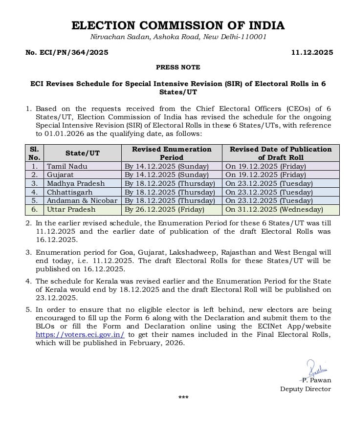 তামিলনাড়ু (Tamilnadu), গুজরাত (Gujarat), মধ্যপ্রদেশ (Madhya Pradesh), উত্তরপ্রদেশ (Uttar Pradesh), ছত্তিসগড় (Chattisgarh) ও আন্দামান-নিকোবরের (Andaman) জন্য রিভাইজড শিডিউল (Revised Schedule) ঘোষণা করা হয়েছে। এই সংশোধিত সময়সূচি অনুযায়ী নির্দিষ্ট রাজ্যগুলিতে বিশেষ নিবিড় সংশোধন পর্ব এক সপ্তাহ বেশি চলবে। আর বাংলা-সহ দেশের অন্যান্য জায়গায় পূর্ব ঘোষণা মতো বৃহস্পতিবারই এনুমারেশন ফর্ম জমার সময়সীমা শেষ হচ্ছে।