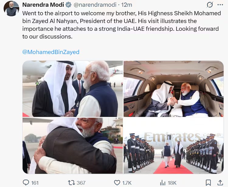 নরেন্দ্র মোদী (Narendra Modi) তাঁর এক্স হ্যান্ডেলে বেশ কিছু ছবি পোস্ট করে লিখেছেন, “আমার ভাইকে স্বাগত জানাতে বিমানবন্দরে এলাম। তাঁর এই সফর প্রমাণ করে, ভারতের সঙ্গে আমিরশাহির বন্ধুত্বকে তিনি কতটা গুরুত্ব দেন। আলোচনার জন্য অপেক্ষা করছি।”