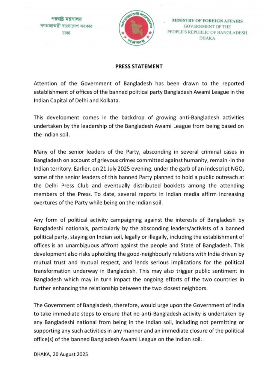 দিন কয়েক আগে একটি অনলাইন সংবাদ মাধ্যমে খবর প্রকাশিত হয় আওয়ামী লিগ কলকাতায় পার্টি অফিস খুলেছে। যদিও দলের তরফে লিখিত বিবৃতি দিয়ে বলা হয়, কলকাতা সহ ভারতের কোথাও আওয়ামী লিগ দলীয় দফতর খোলেনি। বাংলাদেশ সরকারের বিদেশ মন্ত্রকের প্রেস বিজ্ঞপ্তিতে বলা হয়েছে, বাংলাদেশে মানবতা বিরোধী অপরাধে যুক্ত অনেক আওয়ামী লিগ নেতা কর্মী ভারতের মাটিতে দেশ বিরোধী চক্রান্তে জড়িত।