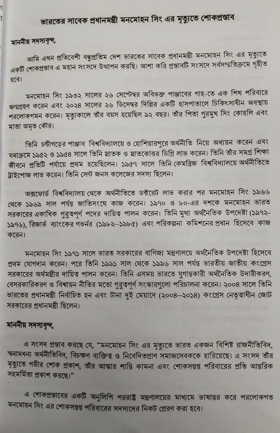 কিন্তু ভারত-বাংলাদেশ সম্পর্কের উন্নয়ন এবং বাংলাদেশের অর্থনৈতিক প্রগতিতে তাঁর অবদানের কোনও উল্লেখ শোক প্রস্তাবে নেই (No mention of Manmohan Singh of his contribution for Bangladesh)। মনমোহন সিং প্রয়াত হন ২০২৪-এর ২৬ ডিসেম্বর।