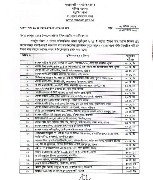 বাংলাদেশ সরকার এবার ১২০০ মেট্রিক টন ইলিশ ভারতে রপ্তানির অনিমতি দিয়েছে। সে দেশের মোট ৩৭টি রপ্তানিকারককে ভারতে ইলিশ রপ্তানির অনুমতি দেওয়া হয়েছে। ৫ অক্টোবর পর্যন্ত কয়েক দফায় ইলিশ আসবে।
