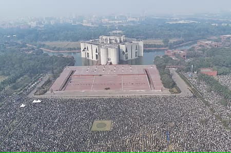 দ্য ওয়াল ব্যুরো: খালেদা জিয়াকে বিদায় জানাতে তাঁর জানাজা বা শেষ যাত্রায় শান্তি কামনায় মানুষের ঢল নেমেছে ঢাকায়। বাংলাদেশ সংসদ ভবনের দক্ষিণ প্রান্তের ময়দানে সমাবেশের আয়োজন করা হয়েছে। এই মুহূর্তে সেখানে তৈরি অস্থায়ী মঞ্চে খালেদা জিয়ার দেহ শায়িত রাখা হয়েছে।