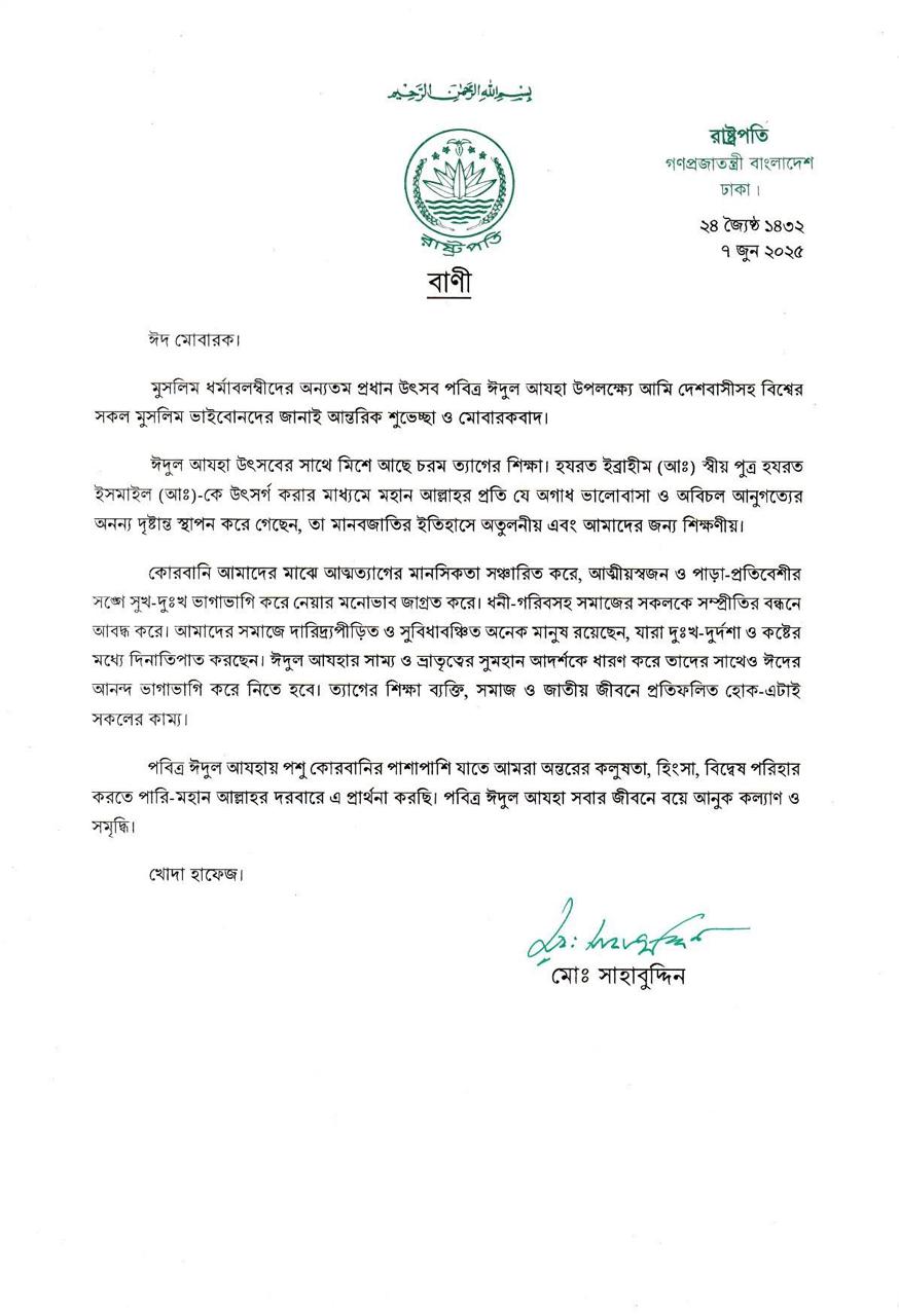 ইসলাম ধর্মাবলম্বীদের পবিত্র এই উৎসব উপলক্ষে দেশবাসীকে শুভেচ্ছা জানিয়েছেন বাংলাদেশের রাষ্ট্রপতি মহম্মদ সাহাবুদ্দিনও। তিনি বলেছেন, দেশে দারিদ্র পীড়িত, সুবিধা বঞ্চিত অনেক মানুষ আছেন। তাদের দুঃখ দুর্দশার শেষ নেই। কষ্টে দিনাতিপাত করছেন। ইদ উল আজহার সাম্য ও ভ্রাতৃত্বের আদর্শকে ধারণ করে তাদের পাশে দাঁড়াতে হবে।