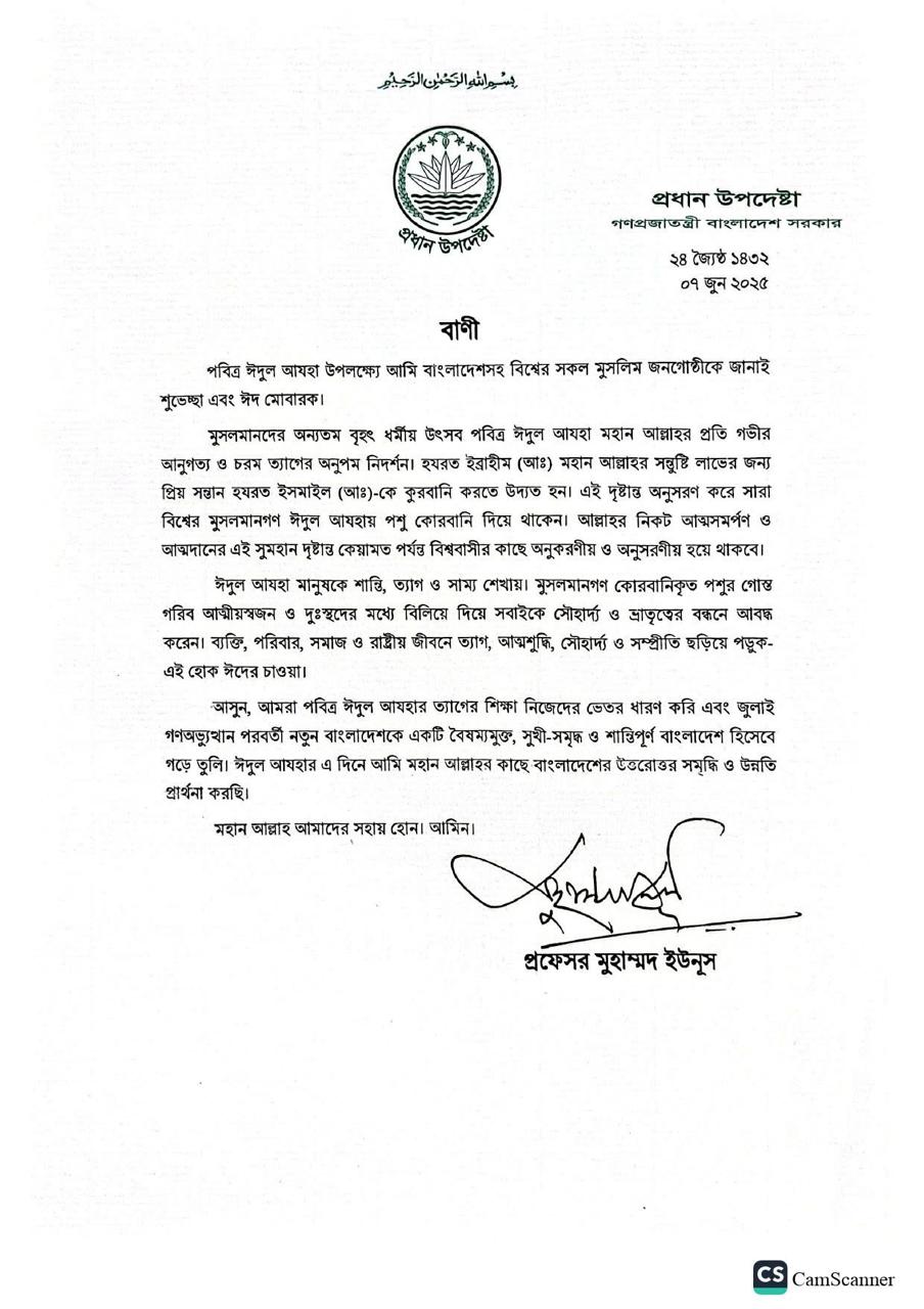ইদ-উল-আজহা উপলক্ষে দেশ ও বিশ্ববাসীকে শুভেচ্ছা জানিয়েছেন বাংলাদেশের প্রধান উপদেষ্টা মহম্মদ ইউনুস।