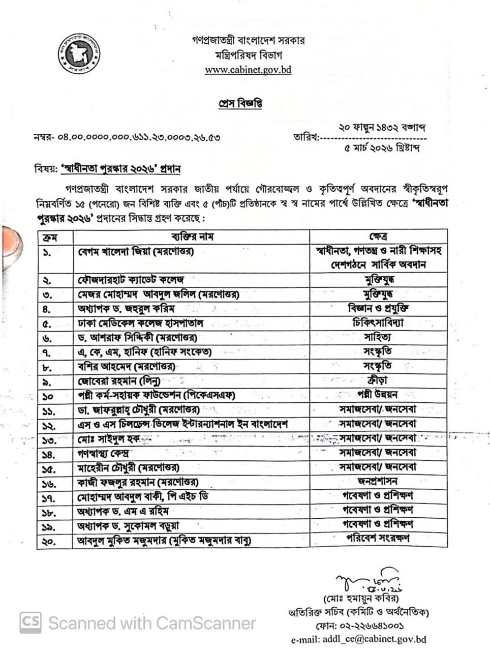 খালেদা জিয়া ছাড়াও আরও ১৯ জনকে এবার স্বাধীনতা পুরস্কারের জন্য মনোনীত করেছে নতুন সরকার। তাঁদের মধ্যে অন্যতম মেজর মহম্মদ আব্দুল জলিল। মুক্তিযুদ্ধে অবদানের জন্য প্রয়াত এই যোদ্ধাকে মরণোত্তর স্বাধীনতা পুরস্কারের জন্য নির্বাচিত করা হয়েছে। মুক্তিযুদ্ধে উল্লেখযোগ্য অবদানের জন্য অধ্যাপক জহুরুল করিমও এবার স্বাধীনতা পুরস্কার পাচ্ছেন। বাংলাদেশ সরকারের সর্বোচ্চ এই অসামরিক পুরস্কার এবার পাচ্ছে ফৌজদারহাট ক্যাডেট কলেজ। মুক্তিযুদ্ধে বিশেষ অবদানের জন্যই ওই প্রতিষ্ঠানকে মনোনীত করা হয়েছে।