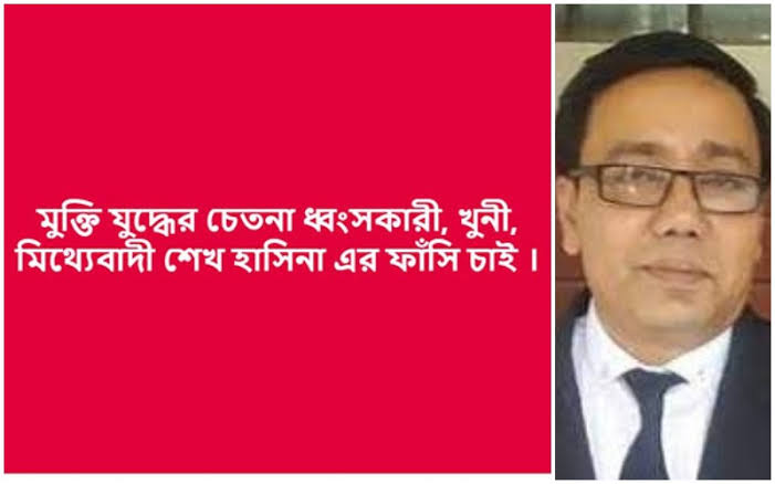 গত বছর ৫ অগাস্ট হাসিনা সরকারের পতনের পর ওই আইনজীবী ফেসবুক পোস্টে লেখেন, 'মুক্তিযুদ্ধের চেতনা ধ্বংসকারী, খুনি, মিথ্যাবাদী শেখ হাসিনার ফাঁসি চাই।'