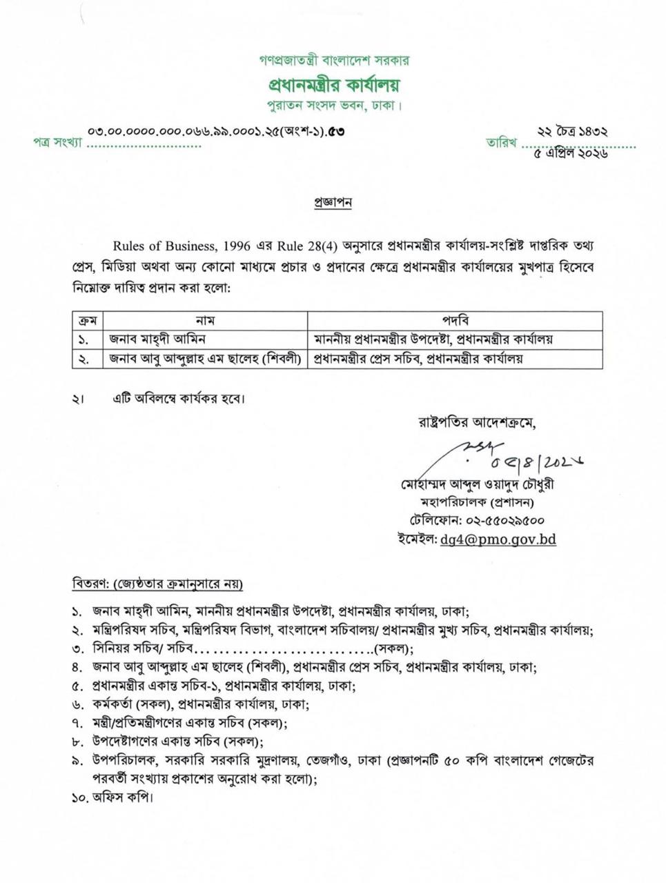 শিবলী ও মাহেদীর নিয়োগ সংক্রান্ত সরকারি বিজ্ঞপ্তিতে বলা হয়েছে, ‘রুলস অব বিজনেস, ১৯৯৬’-এর রুল ২৮(৪) অনুযায়ী প্রধানমন্ত্রীর কার্যালয় সংশ্লিষ্ট দাপ্তরিক তথ্য প্রেস, মিডিয়া বা অন্যান্য মাধ্যমে প্রচারের ক্ষেত্রে তারা মুখপাত্র হিসেবে দায়িত্ব পালন করবেন।
