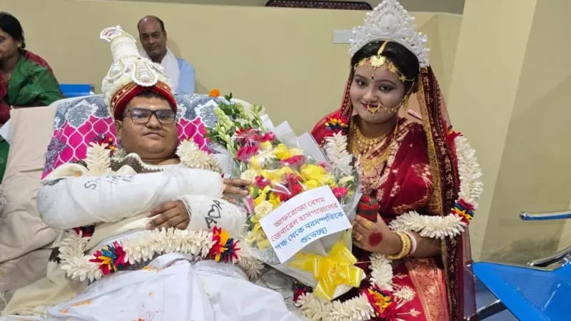দ্য ওয়াল ব্যুরো: হাসপাতালের বেডে শুয়ে এক তরুণ। তাঁর হাত-পায়ে ব্যান্ডেজ। কোমর নড়াতে পারেন না। উঠে বসা দূরে থাক, অন্যের সাহায্য ছাড়া পাশ ফিরতেও পারেন না। সেই তিনি পুরোদস্তুর বরের পোশাক পরে শুয়ে আছেন। পান পাতায় চোখ ঢেকে তাঁর বিছানা প্রদক্ষিণ করছেন বধূ বেশে তরুণী। সেখানেই উলুধ্বনী আর পুরোহিতের মন্ত্রচ্চারণে সম্পন্ন হল আনন্দ সাহা ও অমৃতা সরকারের।