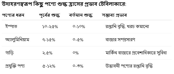 বর্তমান শুল্ক হ্রাস সিদ্ধান্ত এই প্রেক্ষাপটে একটি নতুন দিগন্ত খুলে দিয়েছে। এটি শুধু রপ্তানিকারকদের জন্য নয়, মার্কিন ভোক্তারাও এর সুবিধা পাবেন বলে মনে করা হচ্ছে। এতে দুই দেশের অর্থনৈতিক সহযোগিতা আরও গভীর হবে এবং পারস্পরিক আস্থাও বাড়বে।