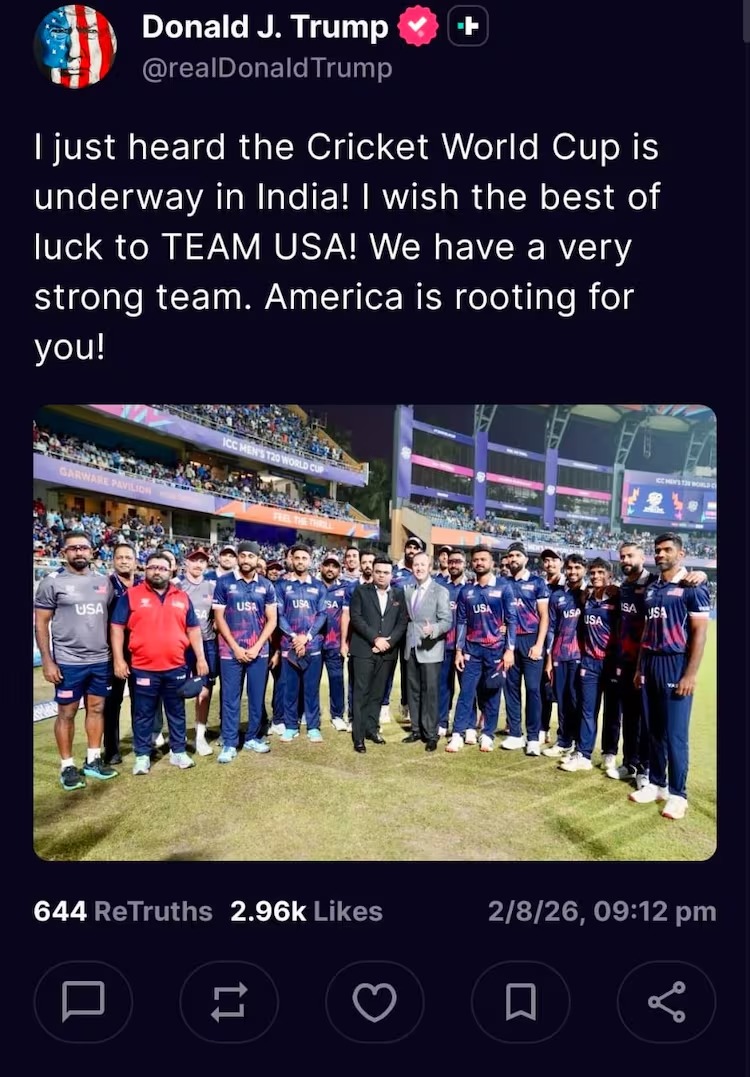 মার্কিন প্রেসিডেন্ট ট্রাম্প রবিবার রাতে নিজের সোশ্যাল মিডিয়া প্ল্যাটফর্ম ট্রুথ সোশ্যালে (Truth Social) লেখেন, ‘আমি সবে শুনলাম, ভারতে ক্রিকেট বিশ্বকাপ চলছে! টিম ইউএসএ-কে (Team USA) অনেক শুভেচ্ছা। আমাদের দল খুব শক্তিশালী। আমেরিকা তোমাদের পাশে আছে!’ শুনতে মিষ্টি শুভেচ্ছার সমস্যা একটাই—এই পোস্ট এসেছে ম্যাচ শেষ হওয়ার অনেক পরে! আগের রাতেই মুম্বইয়ের ওয়াংখেড়ে স্টেডিয়ামে (Wankhede Stadium) ভারত দুরন্ত কামব্যাকে ২৯ রানে হারিয়েছে যুক্তরাষ্ট্রকে।