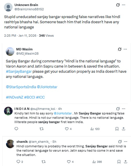 দ্য ওয়াল ব্যুরো: প্রথম ওয়ানডেতে (IND vs NZ, 1st ODI) মাঠের খেলার চেয়েও বেশি আলোচনা তৈরি হল কমেন্ট্রি বক্সে। সৌজন্যে ধারাভাষ্যকার সঞ্জয় বাঙ্গারের (Sanjay Bangar) মন্তব্য। প্রাক্তন ক্রিকেটারের মুখে ‘রাষ্ট্রীয় ভাষা হিন্দি’ উচ্চারিত হতেই নেটদুনিয়ায় ছড়াল তীব্র বিতর্ক। ভারতের আদৌ কোনও রাষ্ট্রীয় ভাষা আছে কিনা—মর্মে উস্কে উঠল পুরনো বাদানুবাদ।