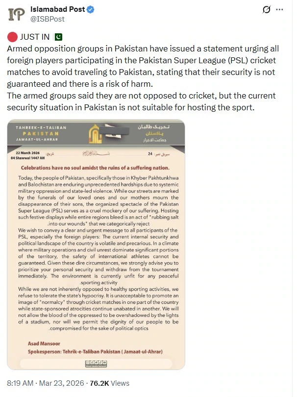পাকিস্তান সুপার লিগ (PSL 2026) ঘিরে বিতর্কের কেন্দ্রে সশস্ত্র জঙ্গিগোষ্ঠী তেহরিক-ই-তালিবান পাকিস্তান (Tehrik-e-Taliban Pakistan)। তাদের জামাত-উল-আহরার শাখার মুখপাত্র আসাদ মনসুর (Asad Mansoor) বিদেশি ক্রিকেটারদের উদ্দেশে সতর্কবার্তা দিয়েছেন। দাবি, দেশের অভ্যন্তরীণ পরিস্থিতি ‘অস্থির ও ঝুঁকিপূর্ণ!’ সামরিক অভিযান, অশান্তি—সব মিলিয়ে আন্তর্জাতিক খেলোয়াড়দের নিরাপত্তা নিশ্চিত করা সম্ভব নয়। তাই অংশগ্রহণ না করার পরামর্শ। বিবৃতিতে আরও বলা হয়েছে, খাইবার পাখতুনখাওয়া (Khyber Pakhtunkhwa) ও বালুচিস্তানের (Balochistan) জটিল পরিস্থিতির মধ্যে এমন ক্রিকেট উৎসব ‘মানুষের যন্ত্রণাকে উপহাস করা’-র সমতুল্য। রাজনৈতিক ও ক্রীড়া পর্যবেক্ষকদের মতে, এই বক্তব্য শুধু হুমকি নয়, পিসিবির (PCB) ভাবমূর্তিতেও বড় ধাক্কা।