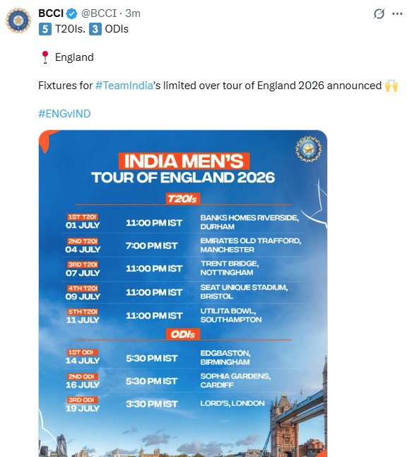 দ্য ওয়াল ব্যুরো: পাঁচখানা টেস্টেই পালা চুকে যাচ্ছে না। পরের বছর টিম ইন্ডিয়া (Team India) আবার যাচ্ছে ইংল্যান্ডে (India Tour of England 2026)। ২০২৬-এর জুলাই মাসে। সেই সফরে ওয়ান ডে টিমে থাকতে পারেন বিরাট কোহলি (Virat Kohli), রোহিত শর্মা (Rohit Sharma)। সাকুল্যে আটটি সাদা বলের ম্যাচ। তার মধ্যে পাঁচটি টি-২০। তিনটি ওয়ান ডে। বিস্তারিত সূচি আজ ঘোষণা করেছে ইংল্যান্ড অ্যান্ড ওয়েলস ক্রিকেট বোর্ড (ECB)।