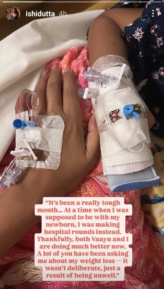 নিজেই ইনস্টাগ্রামে একটি ছবি পোস্ট করে সেই সময়ের কথা ভাগ করে নিয়েছেন ঈশিতা। বলেছেন, “যখন সদ্যোজাতের সঙ্গে থাকার কথা, তখন আমি হাসপাতালে ভর্তি। এটা সত্যিই খুব কঠিন সময় ছিল।” ঈশিতা জানিয়েছেন, হঠাৎ ওজন কমে যাওয়ার কারণ নিয়েও বহু মানুষ প্রশ্ন করেছেন। তাঁদের উদ্দেশে অভিনেত্রীর জবাব, “ওজন কমা একেবারেই ইচ্ছাকৃত ছিল না, বরং অসুস্থতার ফলেই শরীর দুর্বল হয়ে পড়ে।”