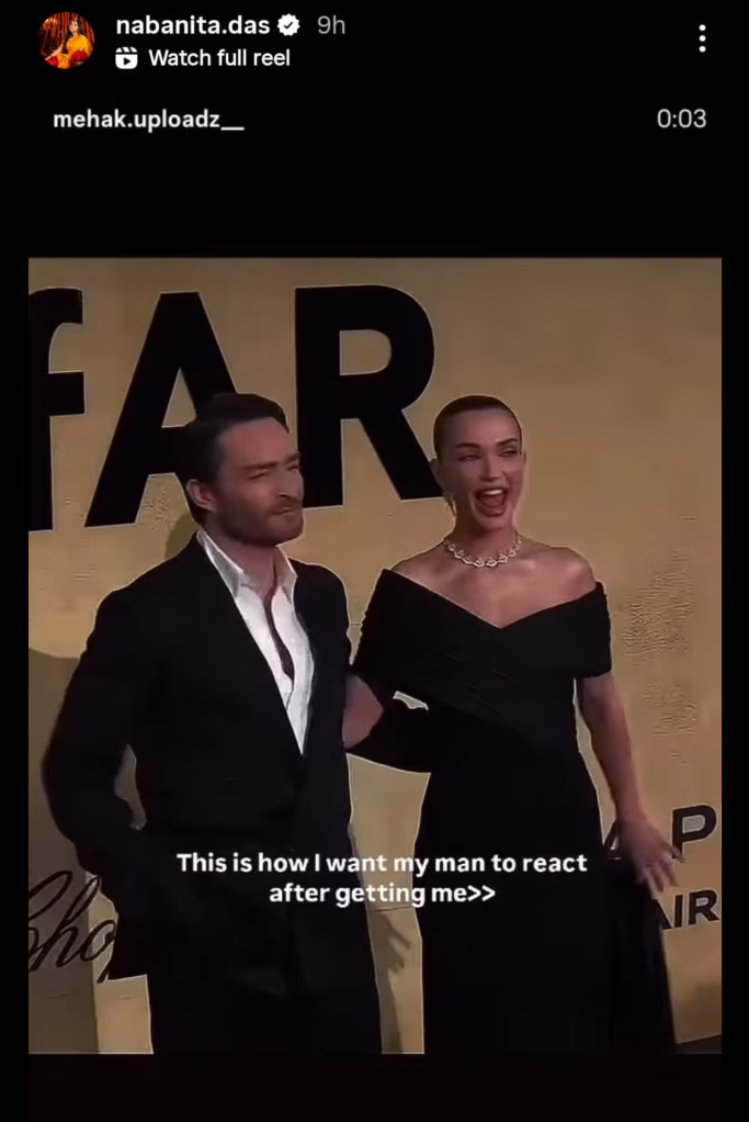 ইনস্টাগ্রাম স্টোরিতে নবনীতা শেয়ার করলেন অভিনেতা এড ওয়েস্টউইক ও এমি জ্যাকসনের এক স্নিগ্ধ মুহূর্তের ভিডিয়ো—রেড কার্পেটের আভিজাত্যঘেরা সময়ের। ক্যামেরা, আলো, পাপারাজ্জি সব কিছু পাত্তা না দিয়ে এড যখন ঠোঁটে আদুরে চুমু রাখলেন এমির, সেই অনভ্যস্ত সময়ে চমকে উঠল এমির মুখ। চুমুর পর এডের অকৃত্রিম উচ্ছ্বাসে যেন ভেসে উঠল ভালোবাসার সহজ, সত্য রূপ। সেই ভিডিয়োর উপর লেখা— “This is how I want my man to react after getting me.” বাংলায় যার মানে, “আমিও চাই আমাকে পাওয়ার পরে আমার মানুষটা ঠিক এমন প্রতিক্রিয়াই দিক।”