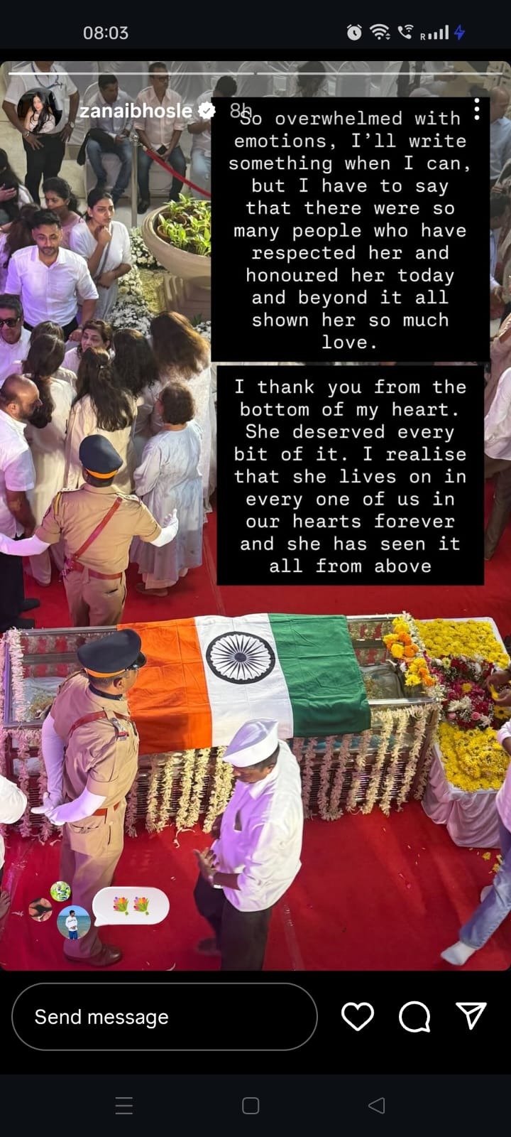 আশা ভোঁসলের মৃত্যুতে সবচেয়ে বেশি ভেঙে পড়েছেন নাতনি জানাই ভোঁসলে। শেষকৃত্যে নিজেকে আর ধরে রাখতে পারেননি তিনি। পরে ইনস্টাগ্রামে দুটি আবেগঘন পোস্ট শেয়ার করেন। একটি পুরোনো ছবির সঙ্গে লিখলেন, “Goodbye my love, love of my life”। আরেক পোস্টে রাষ্ট্রীয় পতাকায় মোড়া আশা ভোঁসলের মরদেহের ছবি দিয়ে জানাই লিখেছেন, “আজ এত মানুষ তাঁকে সম্মান জানালেন, ভালবাসা দিলেন… সবটুকুই তাঁর প্রাপ্য ছিল। তিনি আমাদের হৃদয়ে চিরদিন বেঁচে থাকবেন।”