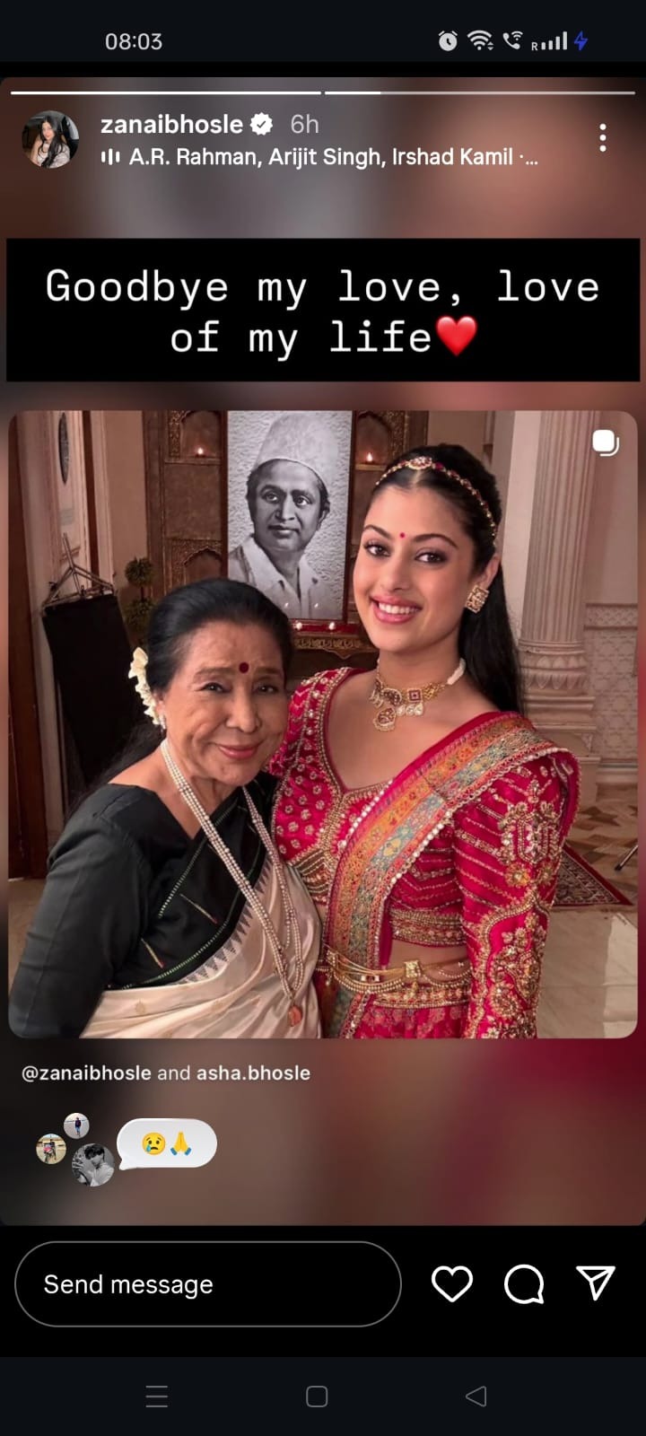 আশা ভোঁসলের মৃত্যুতে সবচেয়ে বেশি ভেঙে পড়েছেন নাতনি জানাই ভোঁসলে। শেষকৃত্যে নিজেকে আর ধরে রাখতে পারেননি তিনি। পরে ইনস্টাগ্রামে দুটি আবেগঘন পোস্ট শেয়ার করেন। একটি পুরোনো ছবির সঙ্গে লিখলেন, “Goodbye my love, love of my life”।
