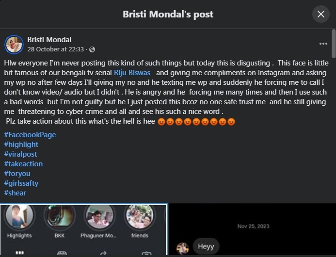 বৃষ্টি নিজের ফেসবুক পোস্টে লিখেছেন, “আমি সাধারণত এমন কিছু শেয়ার করি না, কিন্তু আজ সত্যিই বিরক্ত এবং ঘৃণিত অভিজ্ঞতার মুখোমুখি হয়েছি। এই মুখটা অনেকের চেনা — বাংলা সিরিয়ালের অভিনেতা ঋজু বিশ্বাস। প্রথমে ইনস্টাগ্রামে ভালো কথা বলে, তারপর হোয়াটসঅ্যাপ নম্বর চায়। আমি দিতে রাজি হই, কিন্তু পরে সে বারবার কল করতে জোর করে। আমি না বলায় রেগে যায়, বাজে ভাষায় কথা বলে, আর এখন উল্টে আমাকে সাইবার ক্রাইমে অভিযোগ করার হুমকি দিচ্ছে।”