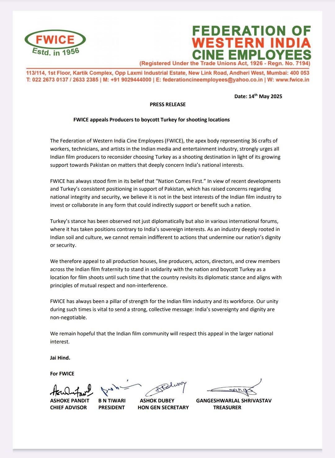 FWICE-এর প্রধান উপদেষ্টা অশোক পন্ডিত এবং সভাপতি বি.এন. তিওয়ারি এক যৌথ বিবৃতিতে জানান, ‘FWICE সব সময় বিশ্বাস করে ‘জাতি সবার আগে’। তুরস্ক বারবার পাকিস্তানের পক্ষ নেওয়ায় এবং ভারতের সার্বভৌমত্ব ও নিরাপত্তার পরিপন্থী অবস্থান গ্রহণ করায়, ভারতীয় সিনেমা ইন্ডাস্ট্রির পক্ষে সেই দেশে বিনিয়োগ বা সহযোগিতা করা মোটেও ন্যায়সঙ্গত নয়।