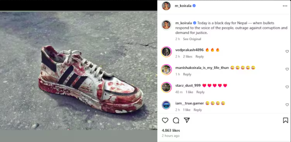 মনীষা নিজের পোস্টে একটি রক্তমাখা জুতোর ছবি শেয়ার করেছেন, যা নিয়ে ইতিমধ্যেই আলোচনা শুরু হয়েছে। সেই ছবির সঙ্গে তিনি লিখেছেন, দুর্নীতি বিরোধী আন্দোলনের কণ্ঠস্বর দমন করতে রক্তপাত কোনও দিনই গ্রহণযোগ্য হতে পারে না।