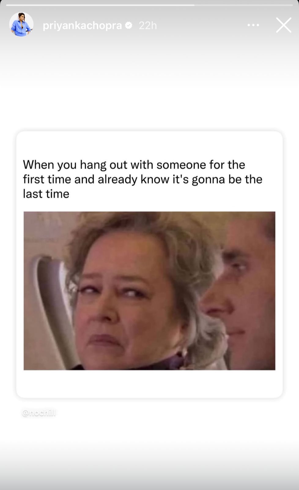প্রিয়াঙ্কা চোপড়ার পোস্টটিতে লেখা ছিল, "যখন আপনি প্রথমবারের মতো কারো সঙ্গে দেখা করেন এবং তখনই বুঝে যান যে এটাই শেষবার।" এই পোস্টের সঙ্গে ছিল জনপ্রিয় মার্কিন কমেডি শো 'দ্য অফিস'-এর অভিনেতা স্টিভ ক্যারেলের একটি ছবি।