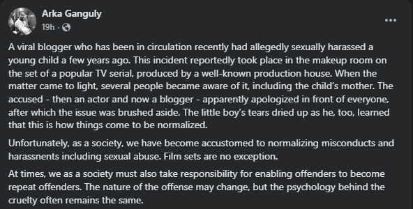 অর্ক তাঁর পোস্টে লেখেন, ওই ঘটনাটি ঘটেছিল একটি নামী প্রযোজনা সংস্থার ধারাবাহিকের মেকআপ রুমে। অভিযুক্ত ব্যক্তি তখন একজন অভিনেতা ছিলেন, বর্তমানে তিনি একজন পরিচিত ভাইরাল ব্লগার। অভিযোগ সামনে আসার পর বিষয়টি অনেকেই জানতে পারেন, যার মধ্যে শিশুশিল্পীর মা-ও ছিলেন। অর্কের দাবি অনুযায়ী, অভিযুক্ত সকলের সামনে ক্ষমা চান এবং তারপর ধীরে ধীরে বিষয়টি চাপা পড়ে যায়।