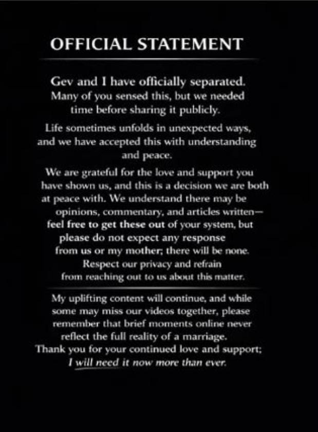 অবশেষে নিজের পোস্টে শ্রীনন্দা লেখেন, তিনি ও গেভ আলাদা পথে হাঁটার সিদ্ধান্ত নিয়েছেন। তাঁর কথায়, এই সিদ্ধান্ত হঠাৎ নয়। অনেকেই হয়তো বিষয়টি আগেই বুঝেছিলেন, কিন্তু প্রকাশ্যে আসতে তাঁদের সময় দরকার ছিল। জীবন সব সময় পরিকল্পনা অনুযায়ী চলে না, সেই বাস্তবতাকেই তাঁরা মেনে নিয়েছেন বলে জানান অভিনেত্রী (Sreenanda Shankar separation)।