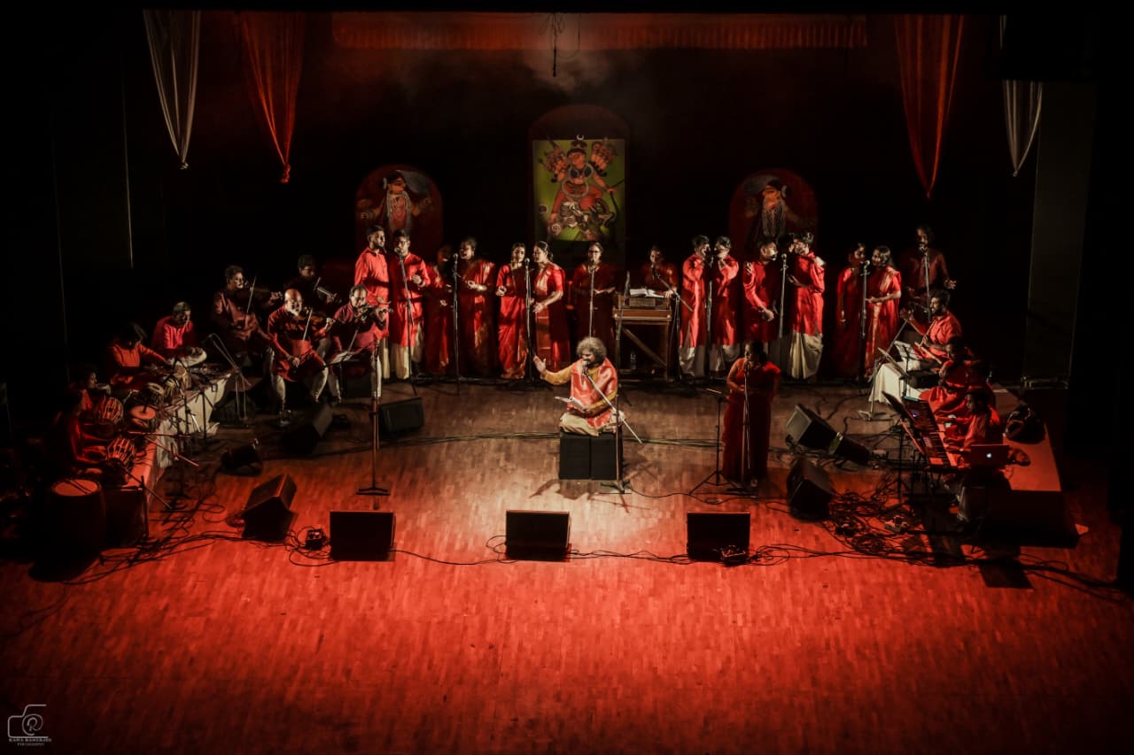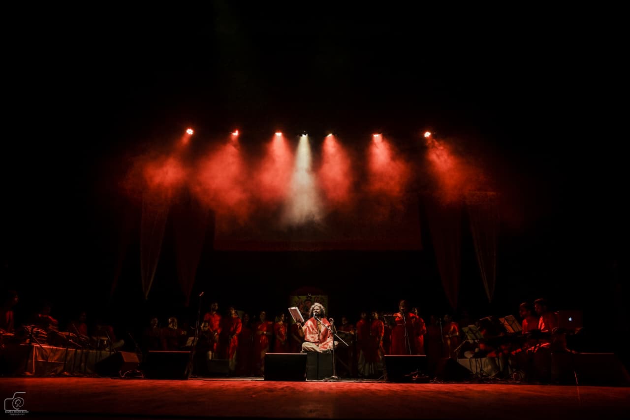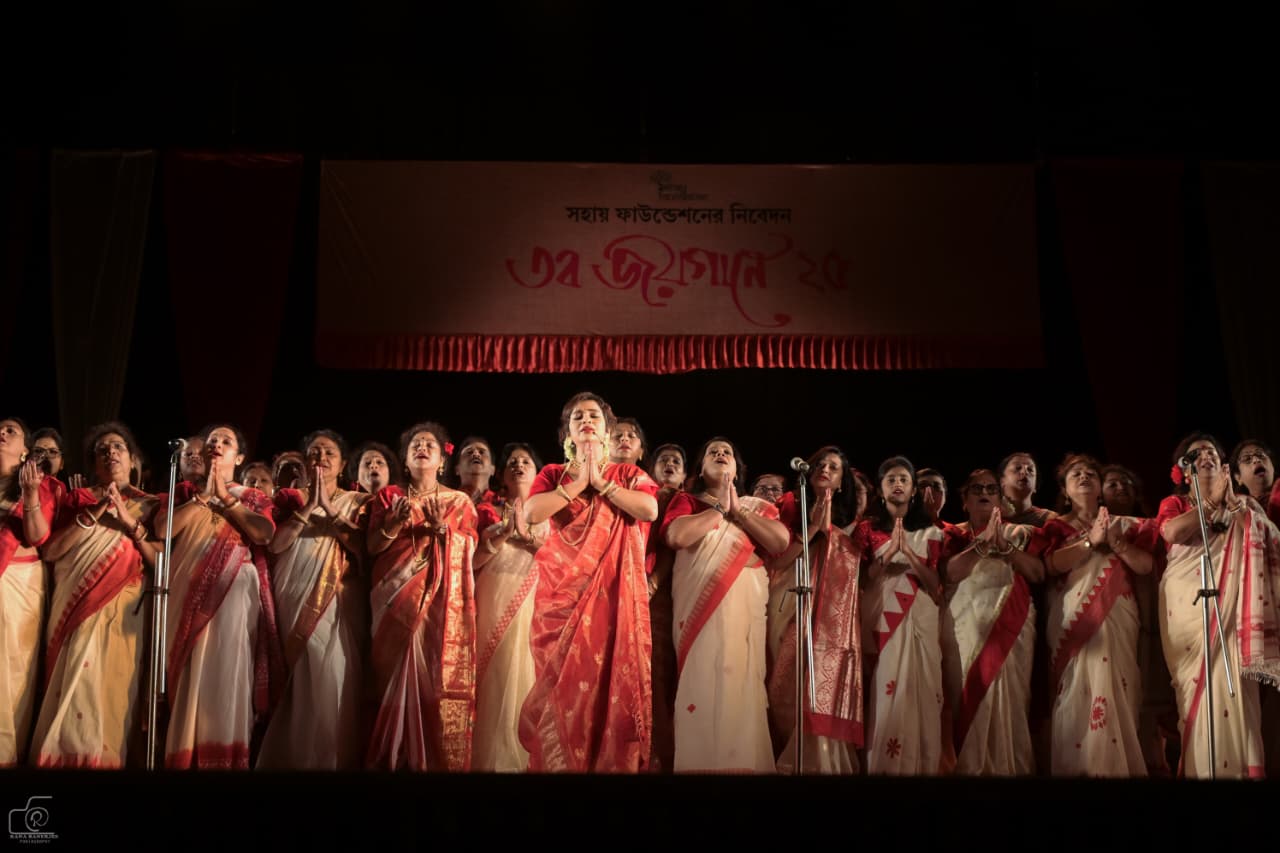 জটাজূটসমাযুক্তামর্ধেন্দুকৃতশেখরাম্' প্রতিটি সমবেত গানে দেবী চণ্ডিকা যেন মঞ্চে আবিভূর্তা হলেন। রূপক নিয়োগীর প্রচার পোস্টার ডিজাইন নজরকাড়া।