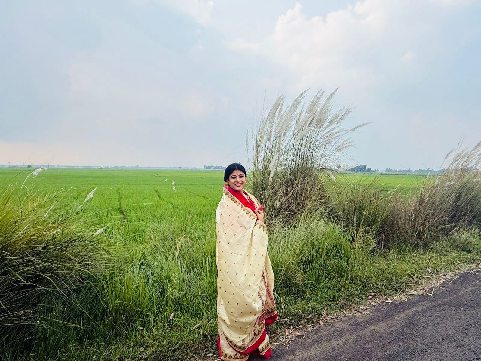 অভিনেত্রী বললেন 'আমার বাপের বাড়ির পুজোর রীতি হল নাকে নথ আর কপালে টিকলি পরতেই হয়। আমি পুজোর সময় সেভাবেই সাজি। আটপৌরে করে কাপড়, হাতে মাটির শাঁখা-পলা, পায়ে নূপুর পরি সঙ্গে আলতা। আমি চূড়াও পরি যেহেতু বাপের বাড়িতে সধবা মেয়েদের চূড়া পরার রেওয়াজ রয়েছে। এই গ্রামের আলতা বউ আমাদের আলতা পরাতে আসবেন। ষষ্ঠীর বোধনের দিনে শাঁখারি কাকা আমাদের বৌ-দের মাটির শাঁখা-পলা পরিয়ে গিয়েছেন। এই মাটির শাঁখা-পলা মা দুর্গাকেও পরানো হয়।'