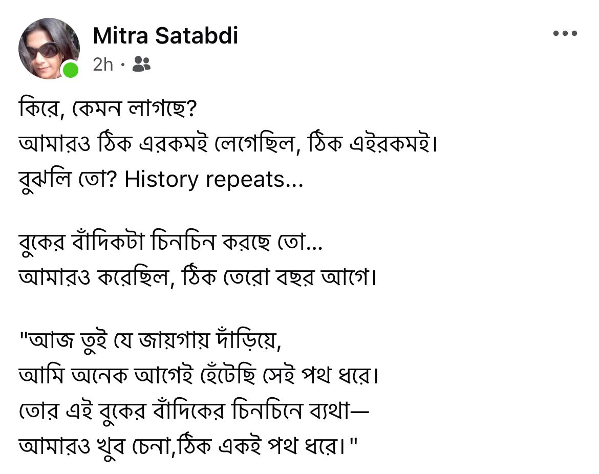 ‘কিরে, কেমন লাগছে? আমারও ঠিক এরকমই লেগেছিল, ঠিক এইরকমই। বুঝলি তো? History repeats... বুকের বাঁদিকটা চিনচিন করছে তো.... আমারও করেছিল, ঠিক তেরো বছর আগে। আজ তুই যে জায়গায় দাঁড়িয়ে, আমি অনেক আগেই হেঁটেছি সেই পথ ধরে। তোর এই বুকের বাঁদিকের চিনচিনে ব্যথা— আমারও খুব চেনা,ঠিক একই পথ ধরে।’