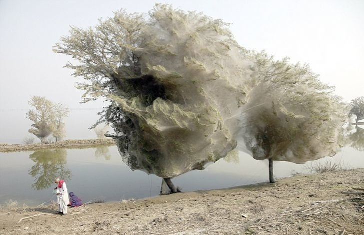 সালটা ২০১১। ভয়াবহ বন্যা দেখল পাকিস্তান। দিনের আলো একটু জোরালো হতেই দেখা গেল, যে গাছগুলো বন্যার আগে এক্কেবারে সবুজ ছিল, সেগুলো যেন নরম সাদা তুলোয় মোড়া। পাতার পর পাতা, ডালের পর ডাল জুড়ে এক অদ্ভুত স্বপ্নময় সাদা স্তর। দূর থেকে দেখলে মনে হবে বিশাল কোনও কোকুন ঝুলছে কানায় কানায়। এ কেমন 'ভূতুড়ে' গাছ? এল কোথা থেকে?
