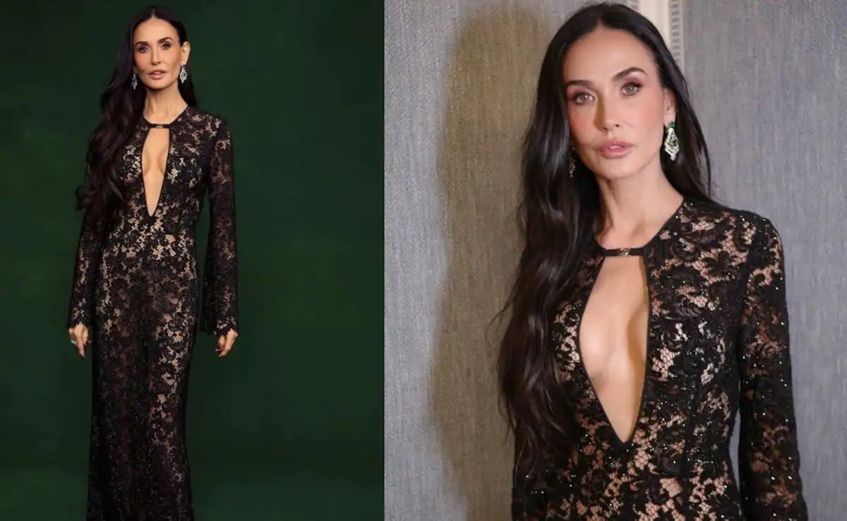 Landman-এর সিজন টুয়ের প্রিমিয়ারে ডেমি মুর একটি কালো স্বচ্ছ গুচির গাউন পরে আসেন। ত্বক দেখতে পাওয়া লেসের এই গাউনে স্বর্গের দেবীর মতো দেখতে লাগছিল মুরকে। কাঁধ থেকে নামা নেকলাই নাভীর কাছে এসে মিলেছিল। পায়ে ছিল ক্ল্যাসিক পাম্পস। মাঝখানে সিঁথি কাটা চুল কাঁধের পাশ দিয়ে পিঠে এসে গড়াগড়ি খাচ্ছিল। তার সঙ্গে বৈপরীত্য হিসেবে পরেছিলেন রুপোর কানের দুল।