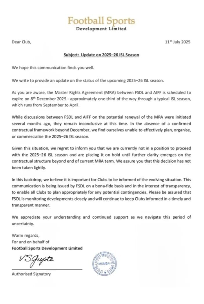 এমনিতেই ভারতীয় ফুটবলের বেহাল দশা। স্মৃতির পাতায় হাঁটলেও ভারত শেষ কবে জিতেছে, তা খুঁজে পেতে সমস্যা হচ্ছে। এর মধ্যেই জানা গেল, আপাতত আইএসএল মুলতুবি রাখার সিদ্ধান্ত নিয়েছে আয়োজক সংস্থা ফুটবল স্পোর্টস ডেভেলপমেন্ট লিমিটেড (SFDL)। আজই (শুক্রবার) চিঠি পাঠিয়ে আইএসএলের সব দলকে সেই সিদ্ধান্তের কথা জানিয়ে দিয়েছে এসএফডিএল। সেই সঙ্গে এই সিদ্ধান্তের কথা চিঠি পাঠিয়ে জানানো হয়েছে এআইএফএফ-কেও।