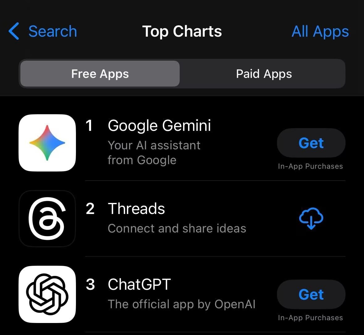 Mint-এর রিপোর্ট অনুযায়ী, অ্যাপ স্টোরের টপ অ্যাপস (Top Apps) সেকশনে প্রথম স্থানে দেখা যাচ্ছে Google Gemini, দ্বিতীয় স্থানে Threads এবং তৃতীয় স্থানে ChatGPT।