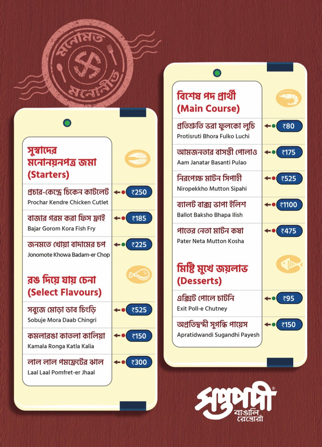 শুধু নামে মজা থাকলেই হবে না। খুঁতখুঁতে যাঁরা, তাঁদের নজরে রসনার পরীক্ষাতেও উত্তীর্ণ হতে হবে। সপ্তপদীর প্রতিটি পদ সেই টেস্টে নামছে প্রকৃত অর্থে। ‘ব্যালট বক্স ভাপা ইলিশ’ ১১০০ টাকা ঠিকই। কিন্তু খাঁটি ইলিশের সৌরভে সেই দাম নস্যি মনে হবে। ‘পাতের নেতা মাটন কষা’ আবার ঝাল-মশলায় রান্না। যাঁদের উত্তেজক ভাষণ শুনলেই রক্ত গরম হয়ে ওঠে, এই পদ তাঁদের চাই-ই-চাই! আপনি যদি রাজনৈতিক বক্তৃতায় বীতস্পৃহ হন, তাহলেও এক পিস মাটন আর এক চামচ গ্রেভি মুখে দিতে দেখতে পারেন। লক্ষ করবেন, বাড়ি ফিরে টেলিভিশনের ধুন্ধুমার সান্ধ্য-ডিবেটও কেমন রোমহর্ষক মনে হচ্ছে!