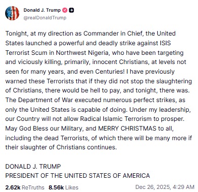 ট্রাম্পের বক্তব্য অনুযায়ী, উত্তর-পশ্চিম নাইজেরিয়ায় (North-West Nigeria) সক্রিয় আইএস জঙ্গিদের লক্ষ্য করে এই হামলা হয়। তিনি লেখেন, “আমার নির্দেশে আমেরিকান বাহিনী আইএস সন্ত্রাসীদের বিরুদ্ধে শক্তিশালী ও প্রাণঘাতী আঘাত হেনেছে। মৃত জঙ্গিদের বলব - মেরি ক্রিসমাস।” তাঁর অভিযোগ, এই জঙ্গিরা মূলত খ্রিস্টান সম্প্রদায়ের নিরীহ মানুষদের নিশানা করে হত্যা করছিল।