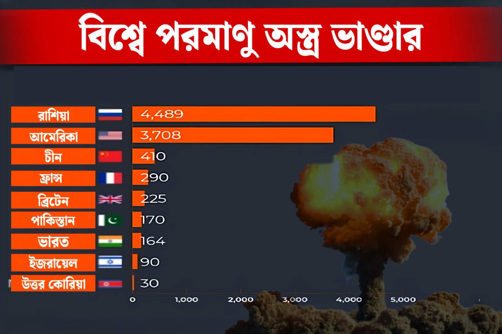 এদিকে, এদিনই উত্তর কোরিয়ার পর চিন, স্পেনও পশ্চিম এশিয়ায় অশান্তির জন্য ইজরায়েল ও ট্রাম্পকে দোষী সাব্যস্ত করে। উল্লেখ্য, এদিনই রাশিয়ার প্রেসিডেন্ট ভ্লাদিমির পুতিনের সঙ্গে সরাসরি কথা বলবেন ইরানের বিদেশমন্ত্রী। সব মিলিয়ে একদিকে যখন ইরান-ইজরায়েলের মধ্যে হামলা-পাল্টা হামলা চলছে, তখন আমেরিকার ভূমিকা নিয়েও বিশ্বজুড়ে প্রবল অসন্তোষ গড়ে ওঠায় অশান্তির মোড় অন্যদিকে ঘুরতে শুরু করেছে। কারণ ২০২৩ সালের গোড়ার দিকে স্টকহোম ইন্টারন্যাশনাল পিস রিসার্চ ইনস্টিটিউটের একটি সমীক্ষা অনুযায়ী, পৃথিবীর ৯টি দেশের হাতে মোট ১২,৫১২টি পরমাণু বোমা রয়েছে। গতবছর পর্যন্ত চিন আরও অন্তত ৬০টি নতুন পরমাণু বোমা যোগ করেছে তাদের সামরিক ভাঁড়ারে। নীচে চিত্রের মাধ্যমে তুলে ধরা হল কোন দেশের হাতে আনুমানিক কটি করে পরমাণু অস্ত্র রয়েছে।