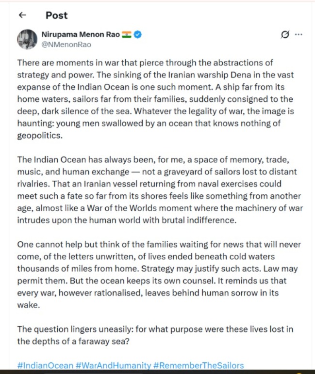 নিরূপমা রাও মনে করিয়ে দিয়েছেন, একটি যুদ্ধজাহাজ মানে শুধু সামরিক শক্তির প্রতীক নয়। সেখানে থাকে বহু তরুণ নাবিক—যাঁরা নিজেদের দেশ থেকে হাজার মাইল দূরে, পরিবার থেকে বহু দূরে দায়িত্ব পালন করেন। সেই জাহাজ হঠাৎ করেই গভীর সমুদ্রের অন্ধকারে তলিয়ে গেলে, তা শুধু একটি সামরিক ঘটনা নয়—এ এক মর্মান্তিক ট্র্যাজেডিও।
