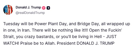 ট্রাম্প তাঁর ‘Truth Social’ পোস্টে স্পষ্ট হুমকি দিয়ে লিখেছেন—মঙ্গলবার ইরানের বিদ্যুৎ কেন্দ্র ও সেতুগুলির ওপর বড়সড় হামলা চালানো হবে। সেই সঙ্গেই ইরানকে উদ্দেশ করে কড়া ভাষায় বলেন, “হরমুজ প্রণালীটা খুলে দাও, না হলে তোদের জন্য নরকের দরজা খুলে যাবে—দেখে নিও!” এই মন্তব্যের মধ্যেই ইরানকে বেজন্মা বলে গালমন্দ করেন ট্রাম্প। সেই সঙ্গে অশালীন শব্দও ব্যবহার করেন, যা নিয়ে বিশ্বজুড়ে সমালোচনা শুরু হয়েছে।