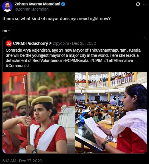 ২০২০ সালের ডিসেম্বরে জোহরান এক্স (তৎকালীন টুইটার)-এ একটি পোস্ট কোট করেছিলেন। মূল পোস্টটি ছিল পুডুচেরি সিপিএমের। পোস্টে সিপিএম লিখেছিল, "কমরেড আর্যা রাজেন্দ্রন, বয়স ২১, তিরুবনন্তপুরমের নতুন মেয়র হয়েছেন। তিনিই হবেন বিশ্বের বড় কোনও শহরের সর্বকনিষ্ঠ মেয়র।" সিপিএমের পোস্টটি রিপোস্ট করে জোহরান প্রশ্ন করেছিলেন— "এই মুহূর্তে নিউ ইয়র্ক শহরের ঠিক কেমন মেয়রের প্রয়োজন?" তাঁর জবাব ছিল— আর্যার মতো একজন তরুণ, প্রগতিশীল, জনগণের প্রতিনিধি।