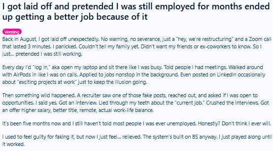 এই ঘটনা প্রকাশ্যে আসে রেডিটের (Reddit)-এ একটি ভাইরাল পোস্টের মাধ্যমে। পোস্টের শিরোনাম, ‘চাকরি চলে গিয়েছিল, কিন্তু আমি ভান করেছিলাম যেন এখনও চাকরি আছে। শেষমেশ আরও ভাল চাকরি পেলাম।’