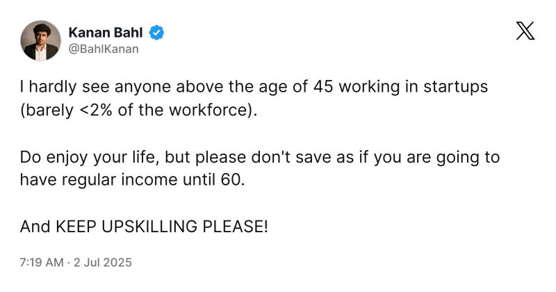 সম্প্রতি বিস্তারিত লিঙ্কডইন (LinkedIn) পোস্টে কানন বহল লিখেছেন, “৪৫ ইজ দ্য নিউ ৬০”। তিনি বলেন, “আপনার অবসর পরিকল্পনা এমনভাবে করবেন না যেন আপনি ভেবে চলেছেন যে, ৬০ বছর পর্যন্ত উপার্জন করতে পারবেন।” তাঁর মতে, প্রযুক্তির অগ্রগতির ফলে চাকরির সংখ্যা বাড়বে ঠিকই, কিন্তু বহু মানুষই নতুন পরিস্থিতির সঙ্গে খাপ খাওয়াতে পারবেন না - “কারণ যাই হোক না কেন”। ফলে অনেকের কর্মজীবন নির্ধারিত সময়ের আগেই থেমে যেতে পারে।